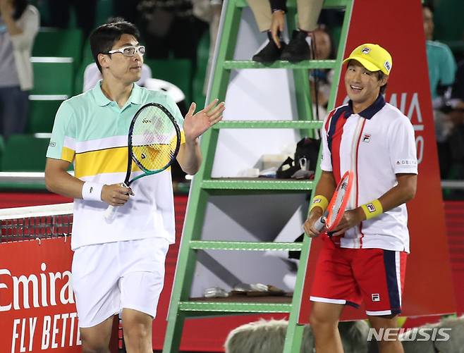 [서울=뉴시스] 김진아 기자 = 28일 오후 서울 송파구 올림픽공원 테니스경기장에서 열린 남자프로테니스(ATP) 투어 유진투자증권 코리아오픈 복식 1회전에서 한스 하흐 버두고(멕시코)-트리트 후에이(필리핀) 조에게 승리를 거둔 정현-권순우가 기뻐하고 있다. 2022.09.28. bluesoda@newsis.com