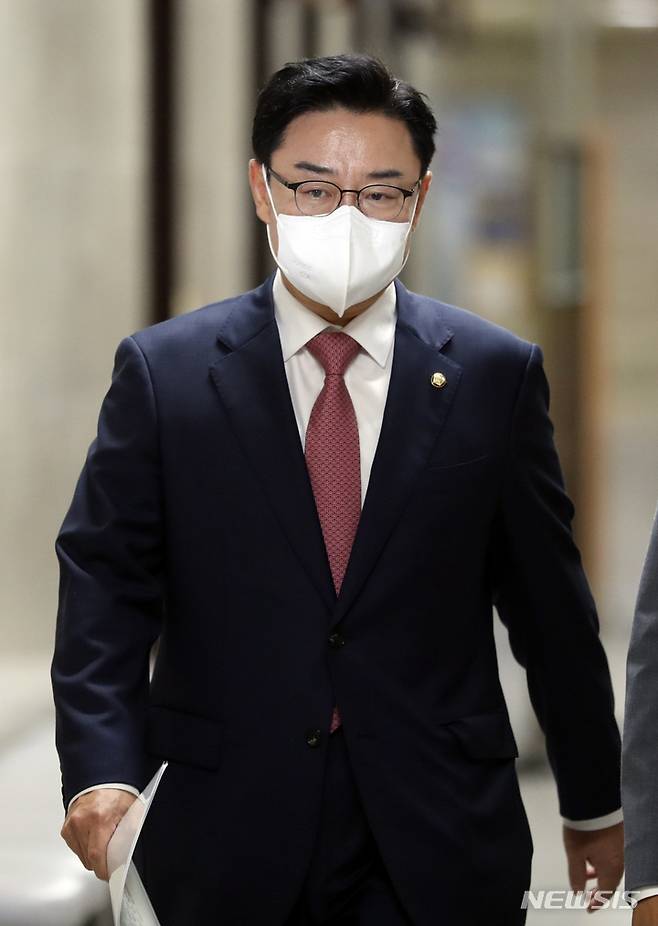 [서울=뉴시스] 최진석 기자 = '수해 현장 실언 논란'으로 물의를 빚은 김성원 국민의힘 의원이 28일 오후 서울 여의도 국회에서 열린 윤리위원회에 출석하고 있다. 2022.09.28. myjs@newsis.com