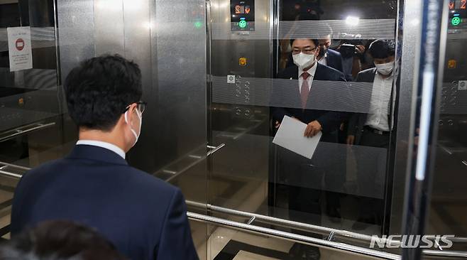 [서울=뉴시스] 최진석 기자 = '수해 현장 실언 논란'으로 물의를 빚은 김성원 국민의힘 의원이 28일 오후 서울 여의도 국회에서 열린 윤리위원회에 출석해 소명을 마친 뒤 이동하고 있다. (공동취재사진) 2022.09.28. photo@newsis.com
