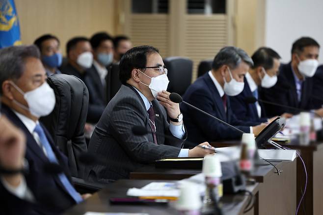 [서울=뉴시스] 김성한 국가안보실장이 28일 용산 대통령실 국가위기관리센터에서 북한의 단거리 탄도미사일 발사 관련 긴급 국가안전보장회의(NSC) 상임위원회를 주재하고 있다. (사진=대통령실 제공) 2022.09.28. photo@newsis.com *재판매 및 DB 금지