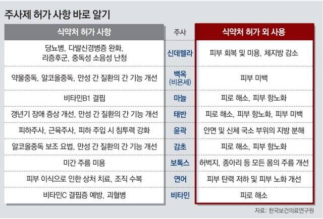 문제는 이런 주사제가 의료 전문가의 판단에 따라 ‘허가 외 사항’으로 자주 처방된다는 점이다. 외국의 경우 이런 주사제들이 우리나라처럼 ‘허가 외 사항’으로 남용되는 경우가 많지 않다. 허가 사항과 다르게 사용되는 대표적인 미용주사제는 ‘백옥 주사’다.