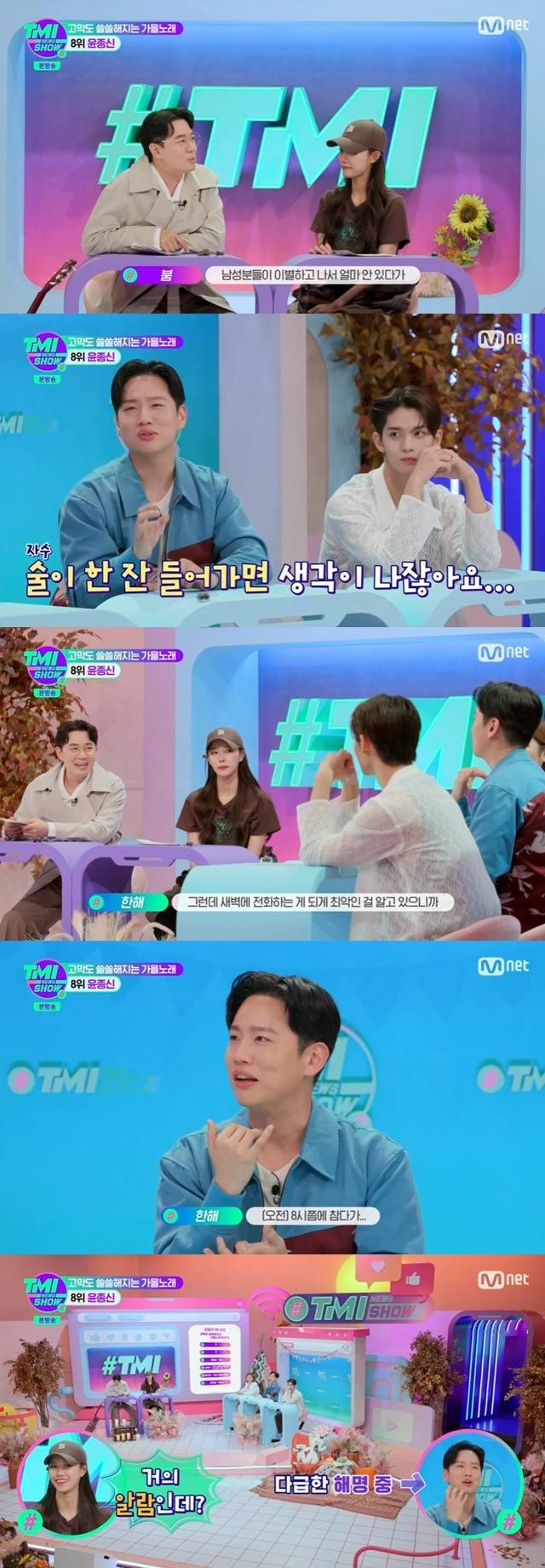 한해가 술을 마시고 구여친에게 전화한 경험을 밝혔다.