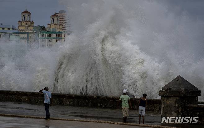 [아바나=AP뉴시스] 28일(현지시간) 쿠바 아바나에서 주민들이 허리케인 이언의 여파로 방파제에 부딪히는 거대한 파도를 바라보고 있다. 허리케인 이언이 휩쓸고 간 쿠바는 나무가 통째로 뽑히고 담배 농장이 파괴됐으며 전력망이 붕괴해 전역에 정전 사태가 빚어졌다. 2022.09.29.