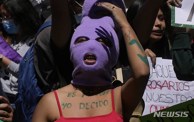 [라파스=AP/뉴시스] 28일(현지시간) 볼리비아 수도 라파스에서 '세계 안전한 낙태의 날' 기념 행진에 나선 한 여성이 낙태 비범죄화를 외치고 있다. 9월 28일은 전 세계 모든 여성의 성적 자기 결정권과 재생산권을 보호하고, 안전하고 합법적인 낙태를 보장하라는 슬로건을 내건 '세계 안전한 낙태의 날'이다. 2022.09.29.