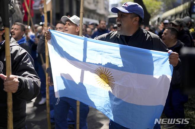 [부에노스아이레스=AP/뉴시스] 28일(현지시간) 아르헨티나 부에노스아이레스의 노동부 밖에서 타이어 제조 노동자들이 높은 인플레이션에 연동된 임금 인상을 요구하며 시위를 벌이고 있다. 2022.09.29.