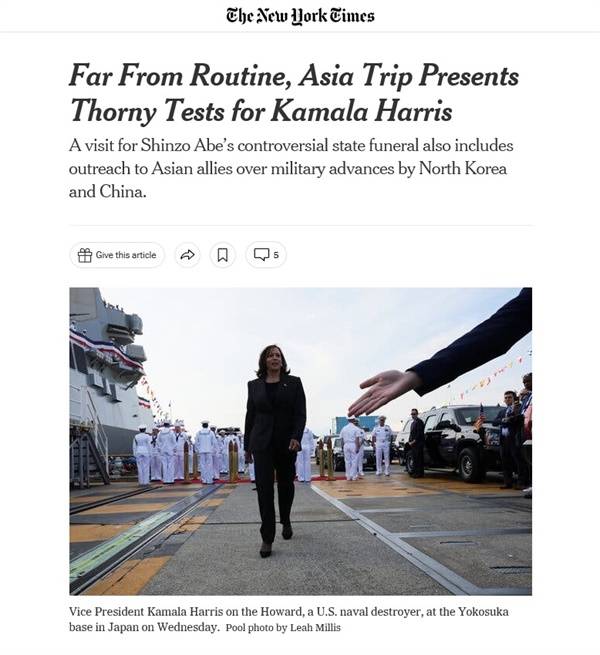 아베 신조 전 일본 총리의 국장 참석차 일본을 방문하고 29일 한국에 오는 해리스 부통령은 <뉴욕타임스>(NYT)와의 인터뷰에서 이같이 말했다.