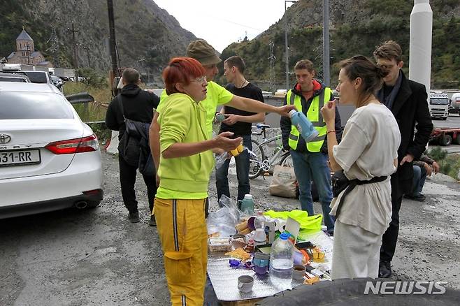 [베르크니 라스=AP/뉴시스] 28일(현지시간) 러시아와 조지아 접경 지역인 베르크니 라스 검문소에서 국경을 넘은 러시아인들이 음식을 먹으며 휴식을 취하고 있다. 2022.09.29.