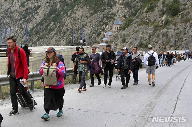 [베르크니 라스=AP/뉴시스] 28일(현지시간) 러시아와 조지아 접경 지역인 베르크니 라스에서 국경을 넘은 러시아인들이 걸어서 이동하고 있다. 2022.09.29.