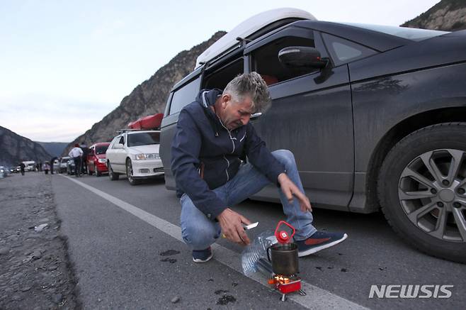 [베르크니 라스=AP/뉴시스] 28일(현지시간) 러시아와 조지아 접경 지역인 베르크니 라스 검문소 주변에 러시아 북오세티야공화국을 통해 조지아로 탈출하려는 차량이 길게 줄 선 가운데 한 남성이 자신의 차 옆에서 간단한 음식을 만들고 있다. 2022.09.29.