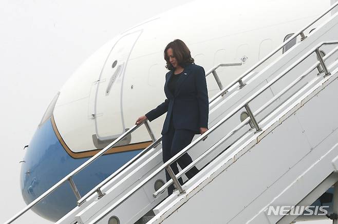 [평택=뉴시스] 사진공동취재단 = 카멀라 해리스 미국 부통령이 29일 경기 평택시 주한미군 오산공군기지에 도착해 전용기에서 내리고 있다. 2022.09.29. photo@newsis.com