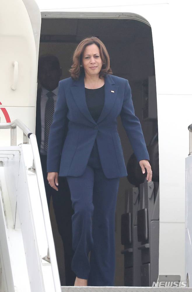 [평택=뉴시스] 사진공동취재단 = 카멀라 해리스 미국 부통령이 29일 경기 평택시 주한미군 오산공군기지에 도착해 전용기에서 내리고 있다. 2022.09.29. photo@newsis.com