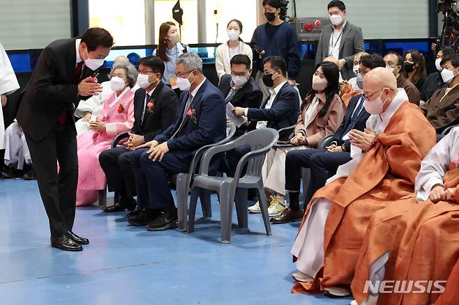 [서울=뉴시스] 박진희 기자 = 오세훈 서울시장이 29일 서울 강남구 서울무역전시컨벤션센터(SETEC)에서 열린 서울국제불교박람회 개막식 축사를 마치고 조계종 총무원장 진우 스님에게 인사를 하고 있다. 2022.09.29. pak7130@newsis.com
