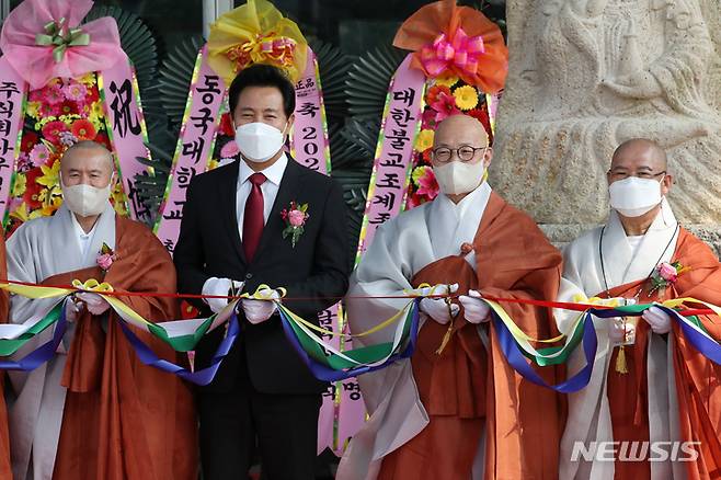 [서울=뉴시스] 박진희 기자 = 조계종 37대 총무원장 진우 스님과 오세훈 서울시장이 29일 서울 강남구 서울무역전시컨벤션센터(SETEC)에서 열린 서울국제불교박람회 개막식 테이프 커팅식을 하고 있다. 왼쪽부터 불교신문사 사장 현법 스님, 오세훈 시장, 진우 스님, 조계종 포교원장 범해 스님. 2022.09.29. pak7130@newsis.com