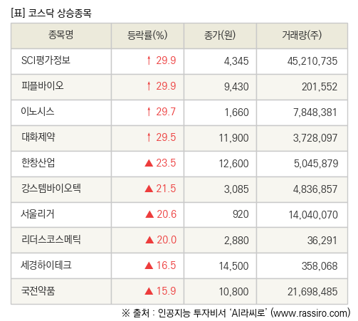 29일 코스닥 시장은 상승 724개, 하락 685개, 보합 107개로 마감했다. 상승한 종목으로 SCI평가정보(036120) 29.9%, 피플바이오(304840) 29.9%, 이노시스(056090) 29.7% 등이 있다.