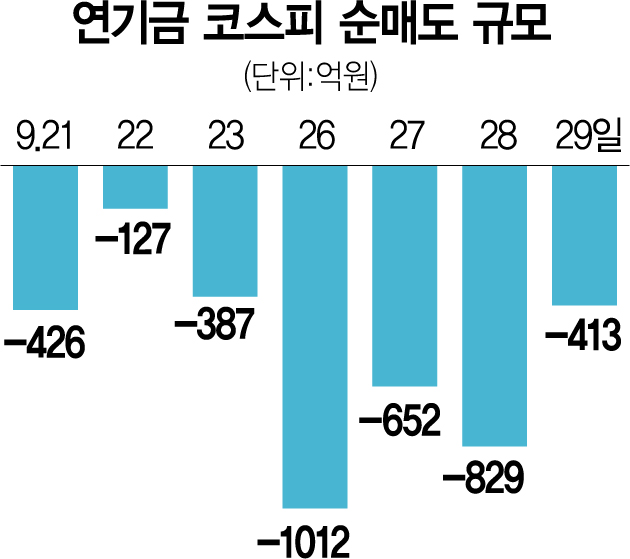 29일 한국거래소에 따르면 국민연금이 주축인 투자 주체 ‘연기금 등’은 이달 21일부터 이날까지 7거래일 연속 순매도세를 보이며 총 3845억 원 내다 팔았다. 이 기간 코스피는 8.32% 하락했다. 코로나19 대유행으로 코스피가 11.69% 하락한 2020년 3월 한 달 동안 연기금 등이 코스피에서 3조 286억 원어치를 사들이며 구원투수로서 활약한 것과 대조된다. 지수가 큰 폭으로 하락하자 금융 당국은 지수 급락을 제어하기 위한 기금인 ‘증안펀드’ 카드를 꺼내 들었지만 연기금은 되레 매도에 가담하고 있다.