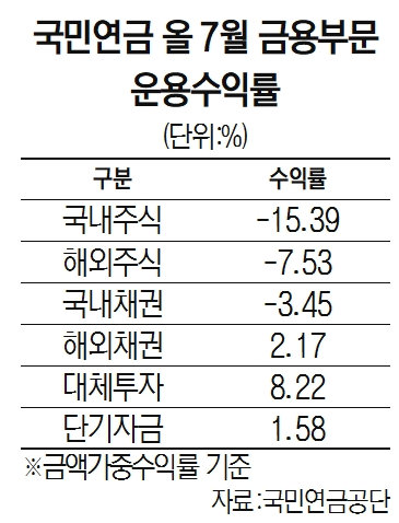 국민연금은 국내 주식 비중을 줄이고 있지만 여전히 운용수익률은 마이너스를 지속하고 있다. 국민연금기금운용본부는 이날 올 들어 7월까지 누적 운용수익률이 -4.69%를 기록했다고 공시했다. 상반기까지의 수익률인 -8%에서 3.31%포인트 회복한 셈이다. 주식 투자에서 큰 손실을 보고 있다. 국내 주식의 7월 평가액은 138조 8340억 원으로 손실액은 25조 원 이상에 달한다. 해외 주식 평가액은 250조 8350억 원으로 7월까지 손실액은 22조 원 규모다.