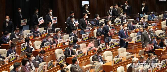 [서울=뉴시스] 최진석 기자 = 국민의힘 정진석 비상대책위원장을 비롯한 의원들이 29일 서울 여의도 국회에서 열린 제400회 국회(정기회) 제09차 본회의에서 피켓을 붙이고 자리에 앉은 더불어민주당 의원들 사이로 피켓을 들고 입장하고 있다. (공동취재사진) 2022.09.29. photo@newsis.com