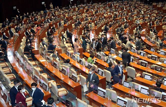 [서울=뉴시스] 최진석 기자 = 국민의힘 의원들이 29일 오후 서울 여의도 국회 본회의에서 국무위원(외교부장관 박진)해임건의안에 대한 송언석 원내수석부대표의 의사진행 발언을 마치고 퇴장하고 있다. (공동취재사진) 2022.09.29. photo@newsis.com