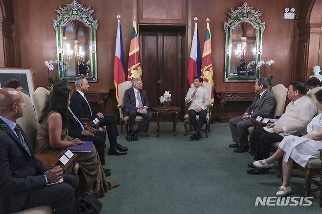 [마닐라=AP/뉴시스] 페르디난드 마르코스 주니어(오른쪽) 필리핀 대통령이 29일(현지시간) 마닐라의 말라카냥 대통령궁에서 라닐 위크레메싱게 스리랑카 대통령과 대화하고 있다. 2022.09.29.