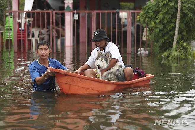 [우본랏차타니=AP/뉴시스] 29일(현지시간) 태국 우본랏차타니 주민들이 반려견과 함께 보트에 올라 제16호 태풍 '노루'로 침수된 거리를 건너고 있다. 폭우와 강풍을 동반한 '노루'가 태국 일부 지역을 휩쓸어 나무가 쓰러지고 곳곳에서 홍수가 발생했다. 2022.09.29.