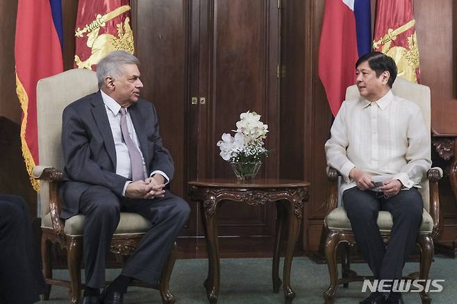 [마닐라=AP/뉴시스] 페르디난드 마르코스 주니어(오른쪽) 필리핀 대통령이 29일(현지시간) 마닐라의 말라카냥 대통령궁에서 라닐 위크레메싱게 스리랑카 대통령과 대화하고 있다. 2022.09.29.