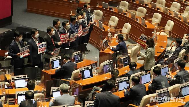 [서울=뉴시스] 최진석 기자 = 국민의힘 정진석 비상대책위원장을 비롯한 의원들이 29일 서울 여의도 국회에서 열린 제400회 국회(정기회) 제09차 본회의에서 피켓을 들고 있다. 2022.09.29. myjs@newsis.com