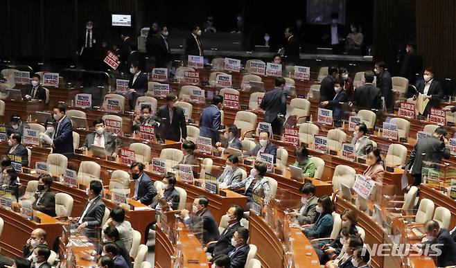 [서울=뉴시스] 최진석 기자 = 국민의힘 의원들이 29일 오후 서울 여의도 국회 본회의에서 송언석 원내수석부대표의 의사진행 발언을 마치고 퇴장하고 있다. (공동취재사진) 2022.09.29. photo@newsis.com