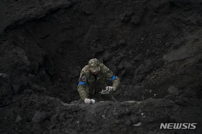 [크라마토르스크=AP/뉴시스] 29일(현지시간) 우크라이나 크라마토르스크에서 우크라이나 경찰관이 러시아군의 공격으로 생겨난 포탄 구덩이의 포탄 종류를 조사하기 위해 파편을 모으고 있다. 2022.09.29.