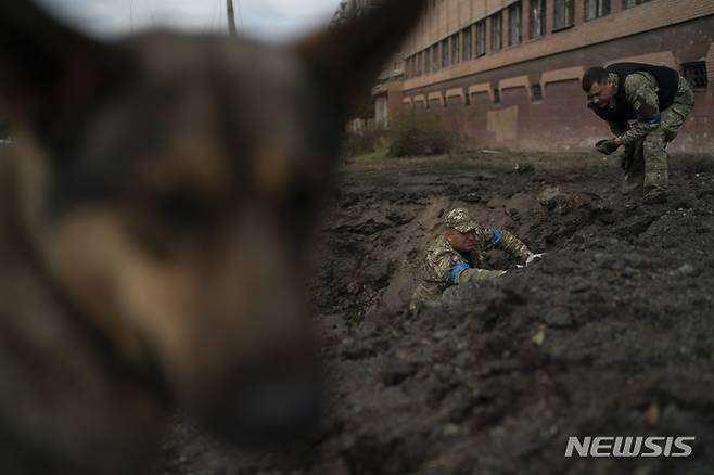 [크라마토르스크=AP/뉴시스] 29일(현지시간) 우크라이나 크라마토르스크에서 우크라이나 경찰이 러시아군의 공격으로 생겨난 포탄 구덩이의 포탄 종류를 조사하기 위해 파편을 모으고 있다. 2022.09.29.