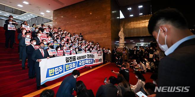 [서울=뉴시스] 최진석 기자 = 국민의힘 의원들이 29일 서울 여의도 국회 로텐더홀 계단에서 박진 외교부 장관 해임건의안 통과 규탄대회를 하고 있다. (공동취재사진) 2022.09.29. photo@newsis.com