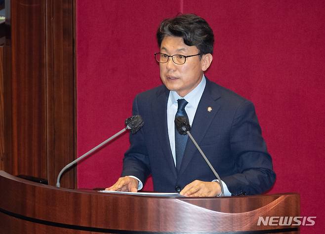 [서울=뉴시스] 최진석 기자 = 진성준 더불어민주당 원내수석부대표가 29일 오후 서울 여의도 국회에서 열린 본회의에서 박진 외교부 장관 해임건의안에 대한 제안설명을 하고 있다. (공동취재사진) 2022.09.29. photo@newsis.com