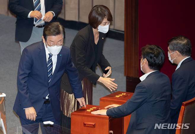[서울=뉴시스] 최진석 기자 = 이재명 더불어민주당 대표가 29일 오후 서울 여의도 국회에서 열린 본회의에서 박진 외교부 장관 해임건의안 무기명투표를 하고 있다. (공동취재사진) 2022.09.29. photo@newsis.com
