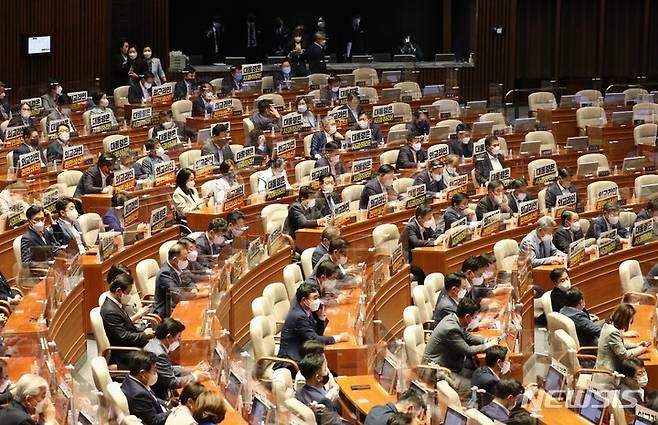 [서울=뉴시스] 최진석 기자 = 더불어민주당 의원들이 29일 오후 서울 여의도 국회에서 열린 본회의에서 의원석 앞에 '대통령은 사과하라', '외교라인 전면쇄신' 등의 피켓을 붙여 놓고 있다. (공동취재사진) 2022.09.29. photo@newsis.com