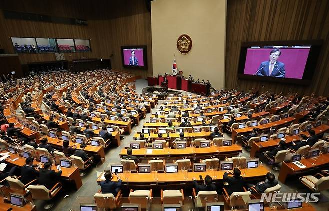 [서울=뉴시스] 최진석 기자 = 송언석 국민의힘 원내수석부대표가 29일 오후 서울 여의도 국회에서 열린 본회의에서 의사진행발언을 하고 있다. (공동취재사진) 2022.09.29. photo@newsis.com