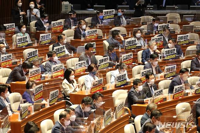 [서울=뉴시스] 최진석 기자 = 더불어민주당 의원들이 29일 오후 서울 여의도 국회에서 열린 본회의에서 의원석 앞에 '대통령은 사과하라', '외교라인 전면쇄신' 등의 피켓을 붙여 놓고 있다. (공동취재사진) 2022.09.29. photo@newsis.com