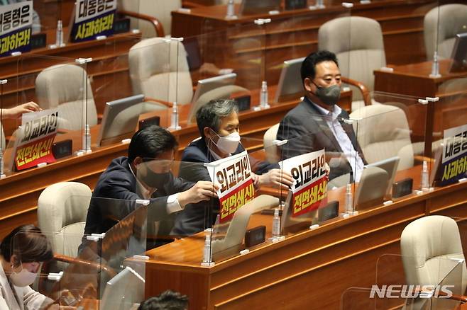 [서울=뉴시스] 최진석 기자 = 더불어민주당 소병훈, 김승남 의원이 29일 오후 서울 여의도 국회에서 열린 본회의에 참석하며 '외교라인 전면쇄신' 이 쓰여진 피켓을 붙이고 있다. (공동취재사진) 2022.09.29. photo@newsis.com