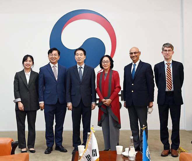 [서울=뉴시스] 이영환 기자 = 김성호(왼쪽 세번째부터) 행정안전부 재난안전관리본부장이 29일 오후 서울 종로구 정부서울청사 대회의실에서 마미 미즈토리(Mami Mizutori) UNDRR 특별대표와 기념촬영을 하고 있다. (사진=행정안전부 제공) 2022.09.29. photo@newsis.com *재판매 및 DB 금지