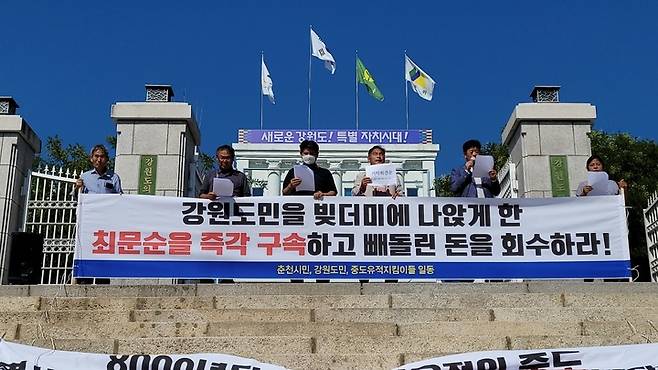 [춘천=뉴시스] 김경목 기자 = 29일 오후 중도유적보존범국민연대회의 회원들이 강원 춘천시 강원도청 앞에서 최문순 전 강원도지사가 평창 알펜시아 입찰 방해 혐의로 형사입건이 된 것과 관련해 최문순 전 도정에서 행해진 각종 사업의 의혹을 철저히 조사할 것을 김진태 강원도지사에게 촉구하고 있다. (사진=중도유적보존범국민연대회의 제공) 2022.09.29. photo@newsis.com