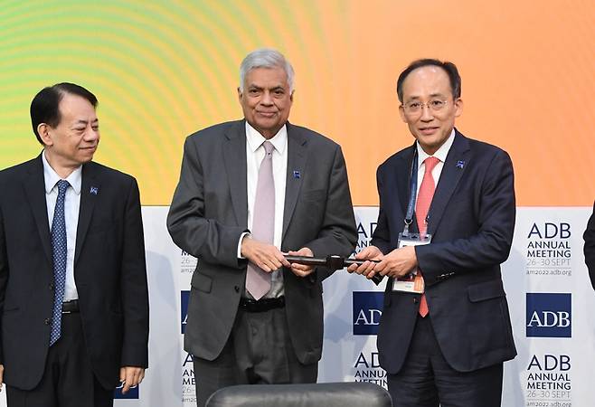 [서울=뉴시스] 이영환 기자 = 제55차 아시아개발은행(ADB) 연차총회 참석차 필리핀 마닐라를 방문중인 추경호 부총리 겸 기획재정부 장관이 29일(현지시간) ADB에서 열린 차기개최국 대한민국 홍보행사에 참석해 의장으로서 라닐 위크레마싱혜 스리랑카 대통령 겸 재무장관에게 바통을 받고 있다. (사진=기획재정부 제공) 2022.09.29. photo@newsis.com *재판매 및 DB 금지