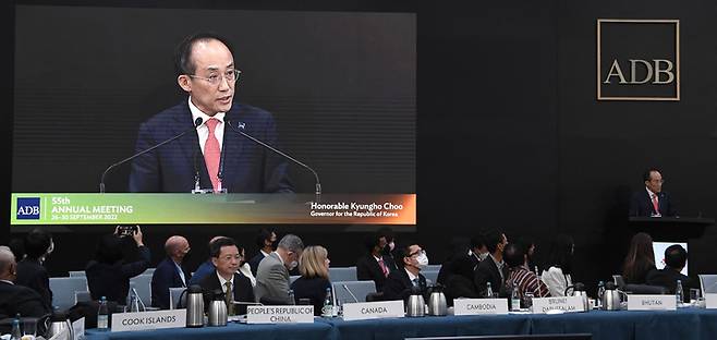 [서울=뉴시스] 이영환 기자 = 제55차 아시아개발은행(ADB) 연차총회 참석차 필리핀 마닐라를 방문중인 추경호 부총리 겸 기획재정부 장관이 29일(현지시간) ADB에서 열린 차기개최국 대한민국 홍보행사에 참석해 의장으로서 환영사를 하고 있다. (사진=기획재정부 제공) 2022.09.29. photo@newsis.com *재판매 및 DB 금지