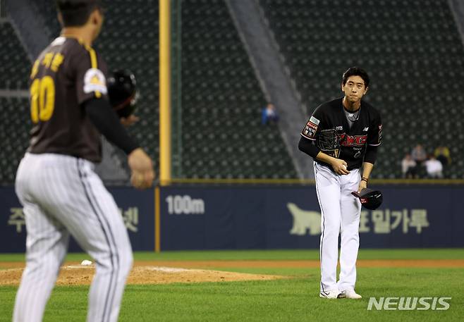 [서울=뉴시스] 조성우 기자 = 29일 오후 서울 송파구 잠실야구장에서 열린 2022 KBO리그 KT 위즈와 LG 트윈스의 경기, LG 8회말 공격 1사 주자 1루서 오지환에게 몸에 맞는 볼을 던진 KT 투수 김민수가 사과하고 있다. 2022.09.29. xconfind@newsis.com