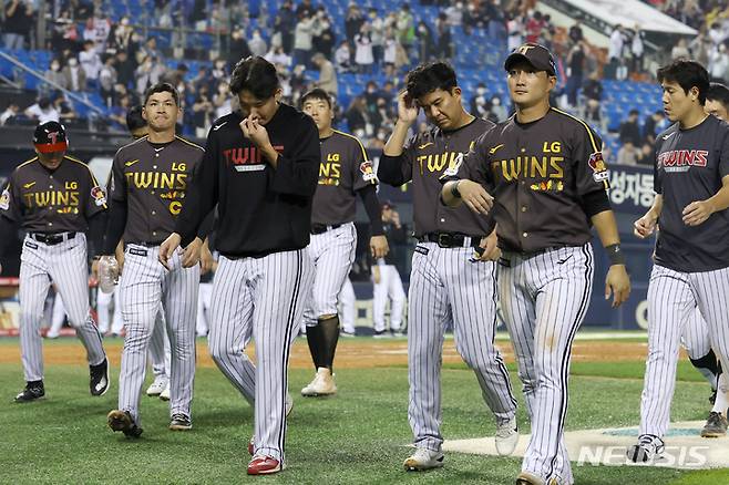 [서울=뉴시스] 조성우 기자 = 29일 오후 서울 송파구 잠실야구장에서 열린 2022 KBO리그 KT 위즈와 LG 트윈스의 경기, LG 선수들이 KT에 3-5 패배한 뒤 아쉬운 표정으로 그라운드를 나서고 있다. 2022.09.29. xconfind@newsis.com