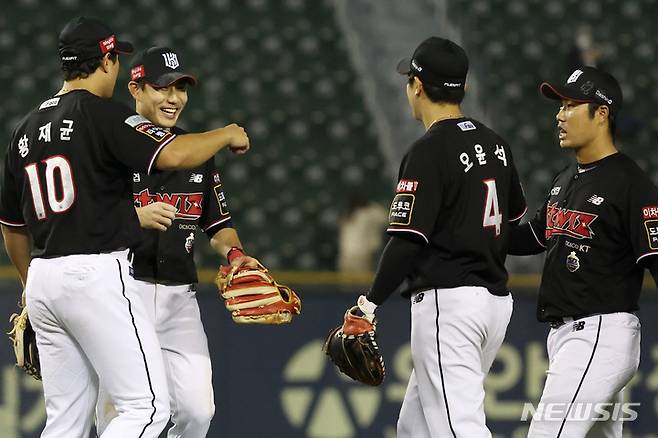 [서울=뉴시스] 조성우 기자 = 29일 오후 서울 송파구 잠실야구장에서 열린 2022 KBO리그 KT 위즈와 LG 트윈스의 경기, KT 선수들이 LG에 5-3 승리를 거둔 뒤 기뻐하고 있다. 2022.09.29. xconfind@newsis.com