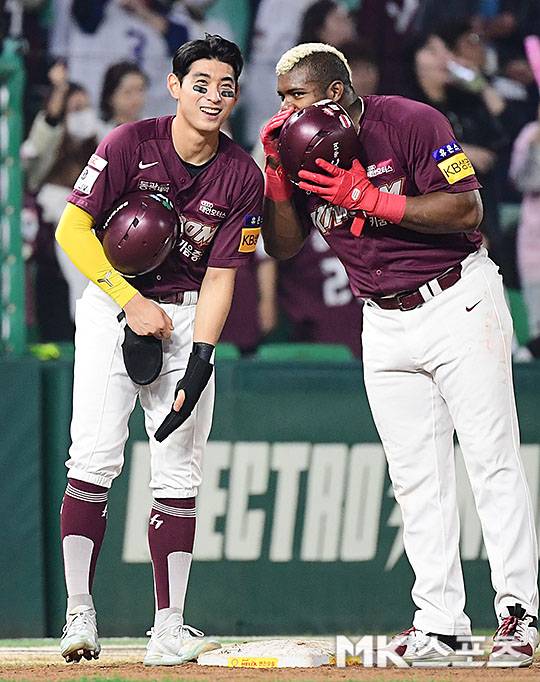 8회초 2사 만루에서 SSG 이태양으로 투수 교체시 루상에 나가 있는 키움 이정후와 푸이그가 환한 표정속에 대화를 나누고 있다.