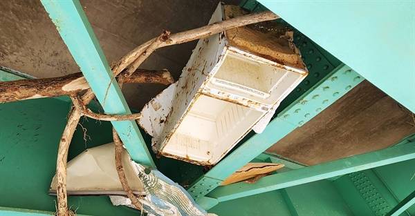 | ▲ 냉천교 다리에 걸려 있는 냉장고와 나뭇가지 |