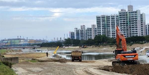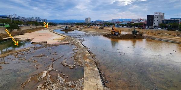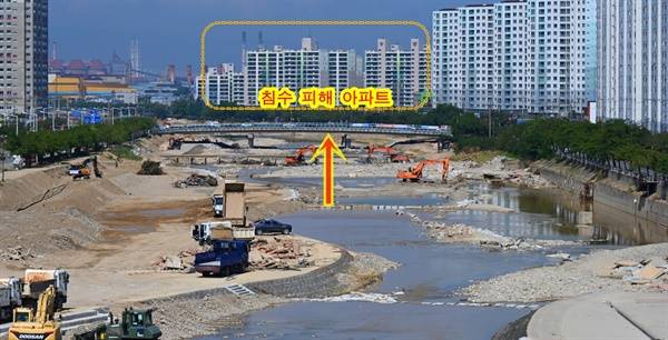 | ▲ 고향의 강 정비사업으로 성토한 타원형의 산책로가 건너편 아파트 침수 피해를 가중시켰음을 보여주는 시공 현장 모습. |