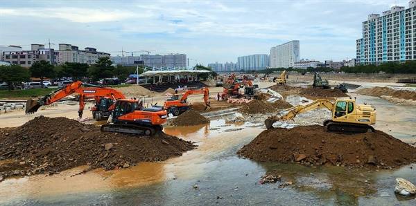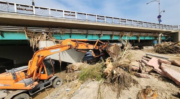 커다란 중장비들이 냉천교 교각에 걸린 나뭇가지들을 끌어내고 있었다. 냉천교와 산책로 사이의 좁은 공간에서는 작은 중장비들이 나뭇가지와 토사들을 연신 퍼내고 있었다. 지난 6일 홍수 당시 냉천교에 막혀 빗물이 흐르지 못한 상황을 가늠할 수 있었다.