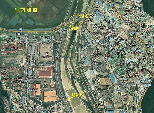 강과 하천은 상류에서 하류로 내려갈수록 폭이 넓어진다. 그런데 포항시 냉천은 하류로 내려갈수록 하천 폭이 좁아진다. 어디서도 볼 수 없는 아주 특이한 구조다.
