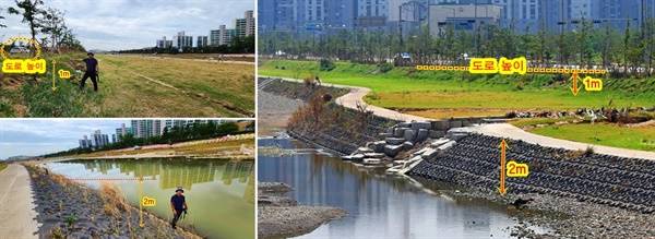 하천변에 나무를 심고 운동시설을 설치하기 위해 제방이 하천 안쪽으로 옮겨졌다. 그 결과 하천 폭이 8~24m 좁아졌다.