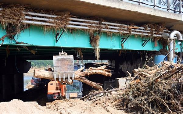 | ▲ 냉천교 좌측 산책로가 흙으로 쌓여 있다. 중장비들이 교각에 걸린 나무 기둥을 끄집어 내고 있다. 다리가 낮고 교각이 많아 물길을 막는 댐이었음을 보여준다. 그 뒤로 침수 피해를 입은 포항제철이 보인다. |